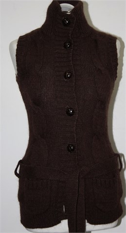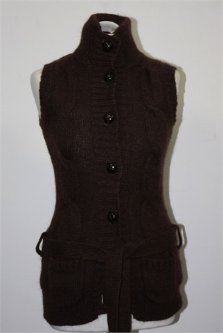 H&M L.O.G.G. vesta bez rukava, tamnije smeđe boje. Prednje kopčanje sa ukrasnim gumbima (najdonji gumb se odšio i ne dolazi uz vesticu), bočni džepići. Pripadajući remen. Mekano, deblje i mucasto pletivo.