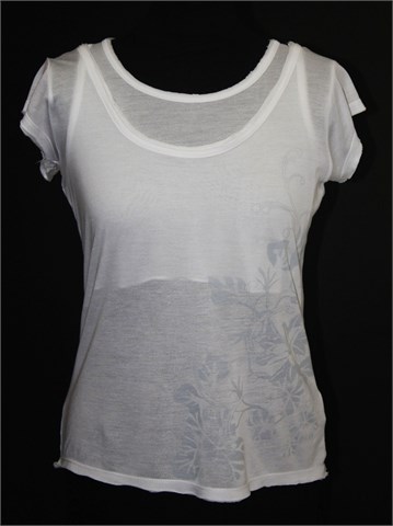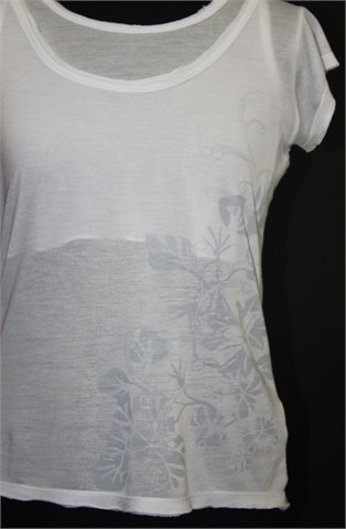 H&M Sport majica bijele boje sa prednji bočnim printom. Dvoslojna, unutar majice je kratki topić. Mekana i vrlo rastezljiva. Rubovi su sirovi (nisu porubljeni - tvornički).