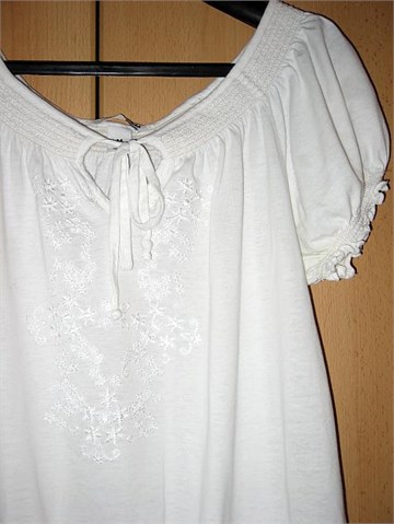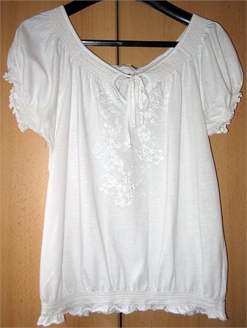 Sastav: 100% pamuk Kratki puf rukavići. Gumice na ovratniku i pasici majice. Naprijed aplikacija našivena koncem i mali otvor sa vezicom. Rastezljiva. Može se nositi i spuštena na ramena.