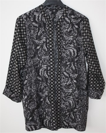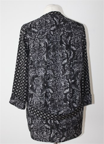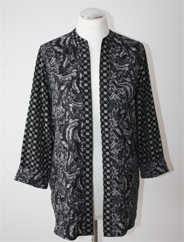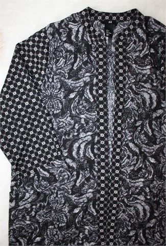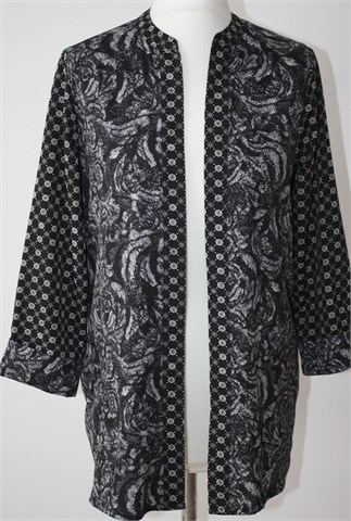 H&M blazer sa poludugim rukavima, crne boje sa printom (boje i uzorak printa vidljivi na slikama). Bez kopčanja, prednji džepovi. Tanak i lagan materijal, nije rastezljiv.