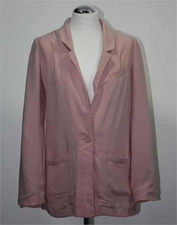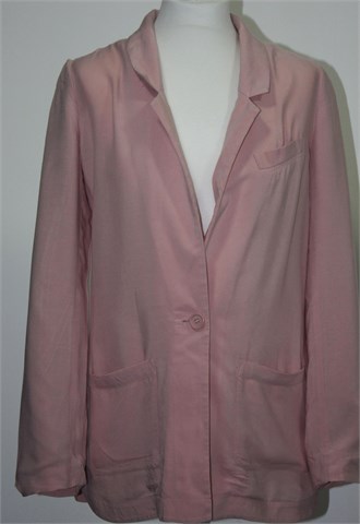 H&M blazer lijepe pastelno roze boje od lagane i vrlo ugodne viskoze. Prednje kopčanje sa jednim gumbom, bočni džepovi. Stražnji prorez (na sredini). Rukavi su podstavljeni sa podstavom roze boje (mogu se nositi podfrknuti).