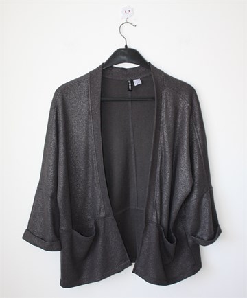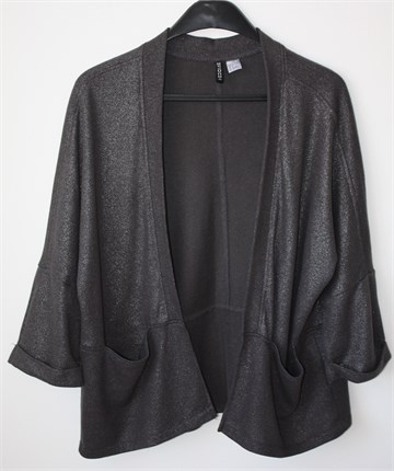 H&M blazer tamno sive boje sa srebrnim sjajem, rukavi su poludugi (širi u gornjem dijelu, uži u donjem). Bez kopčanja, prednji džepovi. Tanji materijal, rastezljiv.