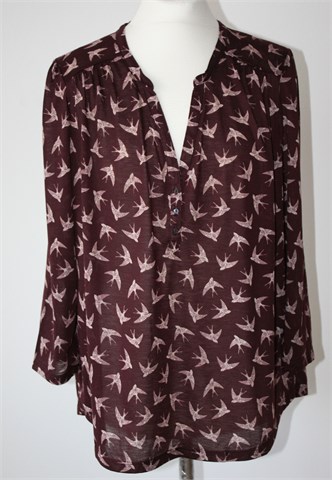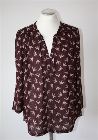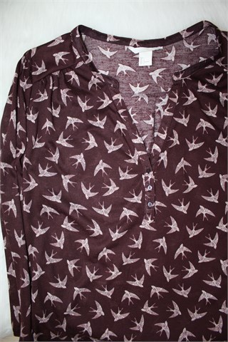 H&M bluza sa poludugim rukavima, bordo-ljubičasto-smeđe boje sa svijetlim printom ptica. Prednji gumbići, mali bočni prorezi. Tanji i lagan materijal, blago providan. Rastezljiva.