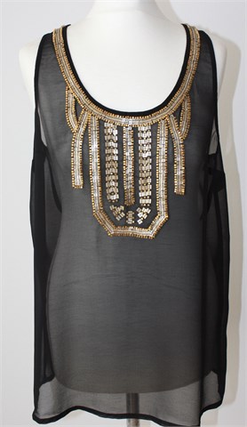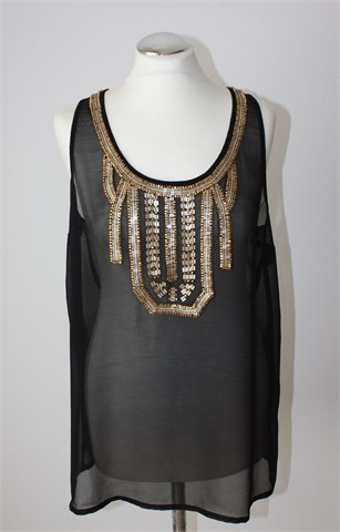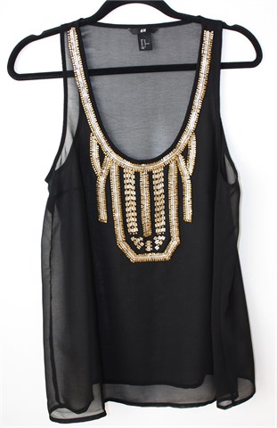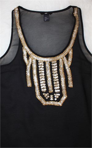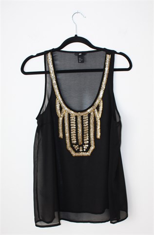 H&M bluza bez rukava, crne boje sa našivenim zlatnim aplikacijama (sa prednje strane). Tanja i lagana, providna.