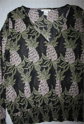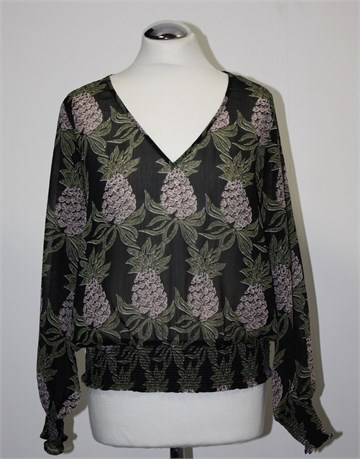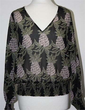 H&M bluza sa dugim rukavima, crne boje sa printom ananasa. U pasici i na krajevima rukava stegnuta/prošivena gumicama. Lagana i prozračna, providna.