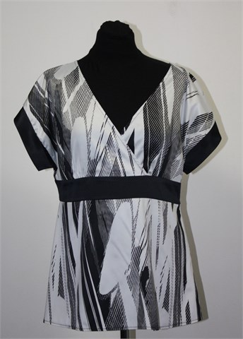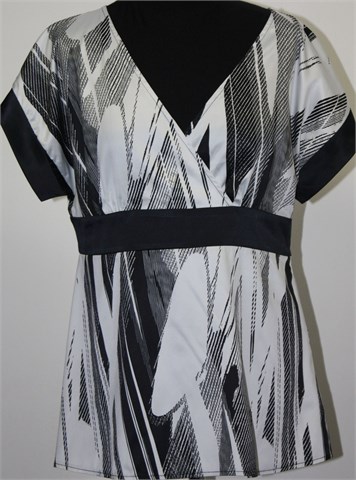H&M bluza sa kratkim rukavima, crno-sivkasto bijele boje sa printom (uzorak printa vidljiv na slikama). Tanji, i blago rastezljiv materijal, na dodir svilenkast. Širi otvor rukava, rezana ispod prsiju. Bočni cif.