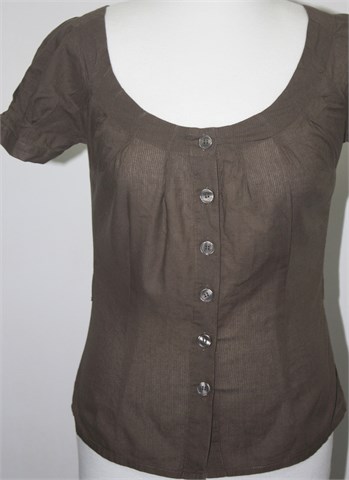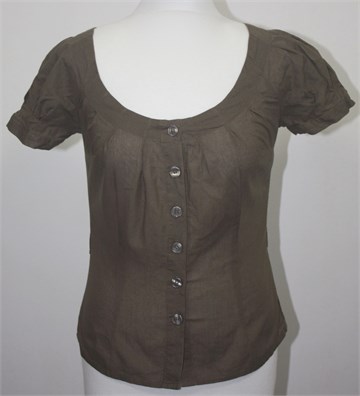 H&M bluza sa kratkim rukavima, maslinasto-smeđe boje sa diskretnim prugama. Prednje kopčanje, pufasti rukavići. Lagana i prozračna.