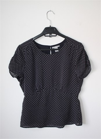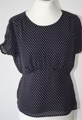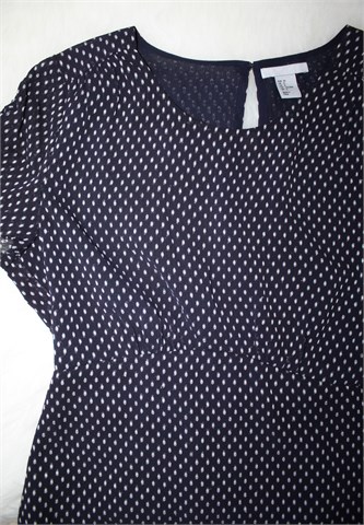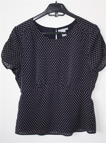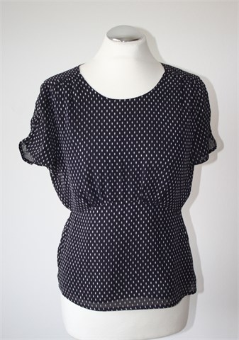 H&M bluza sa kratkim rukavima, tamno plave boje sa bijelim uzorkom (vidljivo na slikama). Stražnji gumbić i mali otvor, gumicom naboran materijal na rukavićima. Rezana ispod prsiju, podstavljena. Lagana i prozračna, blago rastezljiva.