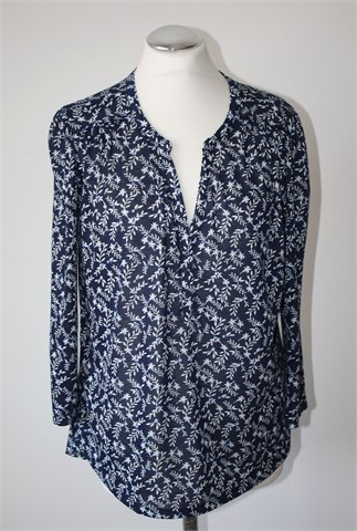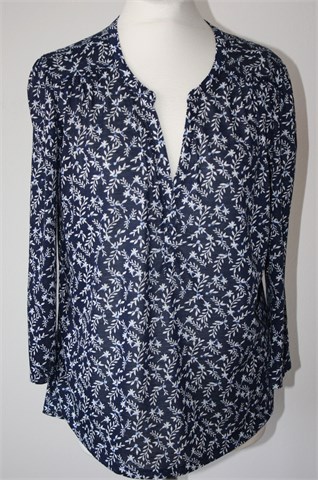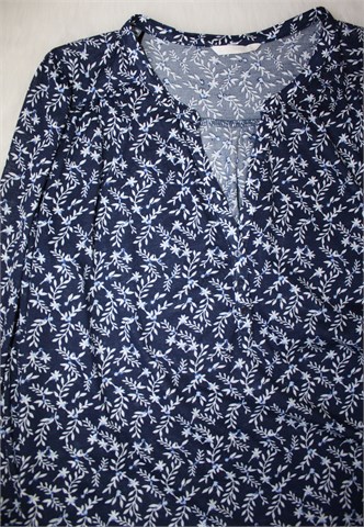 H&M bluza sa poludugim rukavima, tamno plave boje sa printom/uzorkom (boje i uzorak printa vidljivi na slikama). Prednji gumbići, mali bočni prorezi. Tanji i lagan materijal, blago providan. Rastezljiva.