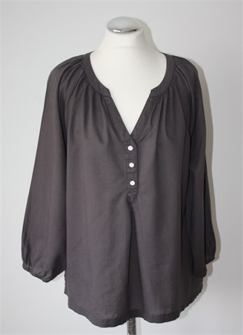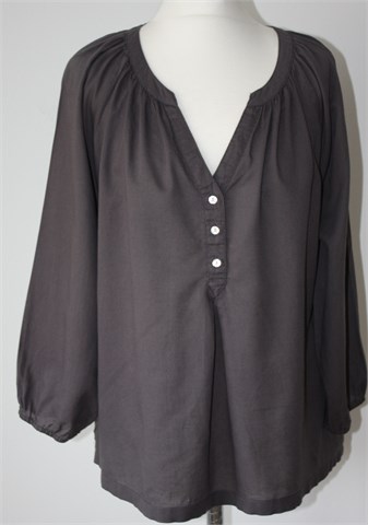 H&M bluza sa poludugim rukavima, sive boje (materijal ima diskretno prugasti uzorak). Prednje kopčanje sa tri ukrasna/sedefasta gumbića, gumica na kraju svakog rukava. Mekan pamuk, nije rastezljiv. Komotniji model - vidjeti mjere.