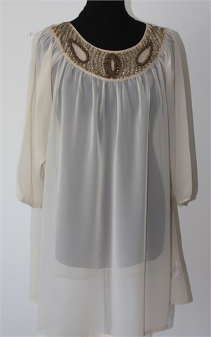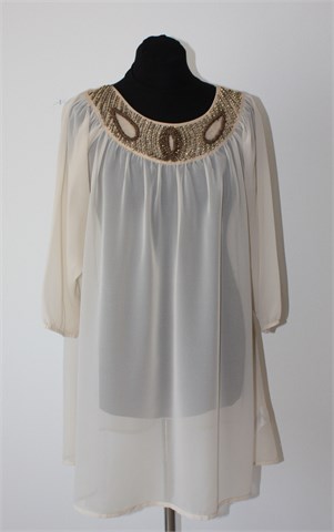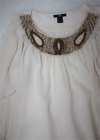 H&M bluza/tunika sa poludugim rukavima, nude boje. Sa prednje strane našivene aplikacije (vidljivo na slikama), dno rukava blago stegnuto gumicom. Tanka i lagana, providna. Nije rastezljiva.