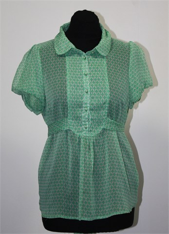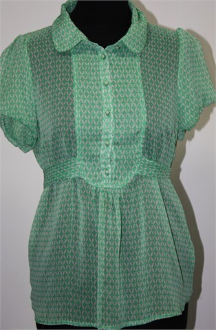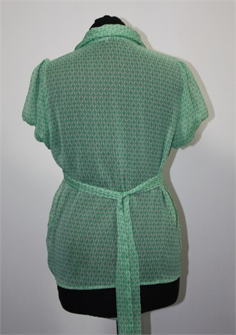 H&M bluza sa kratkim rukavima, zelene boje sa bijelim uzorkom. Prednje kopčanje i vezanje sa dužim trakama (vidjeti slike). Tanji, lagan i blago rastezljiv materijal (providna).