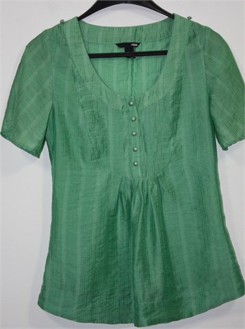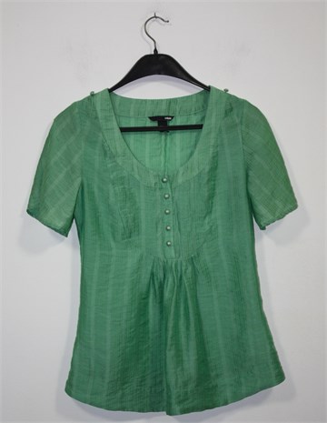 H&M bluza sa kratkim rukavima, zelene boje sa diskretnim prugama. Sa prednje strane gumbići, rukavići se mogu nositi i kao kraći (vezice unutar rukava i gumbić na ramenu). Blago sjajan materijal.