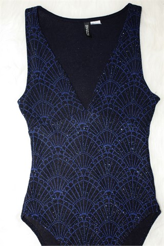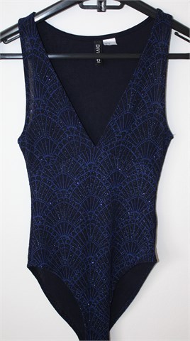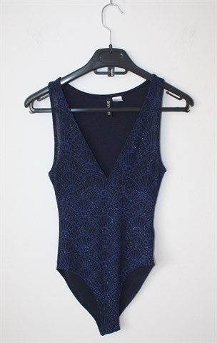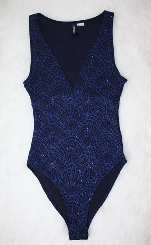 H&M body/majica bez rukava tamno plave boje sa plavim printom i sitnim aplikacijama na materijalu. Dekoltiran, kopčanje sa drukerima između nogu. Rastezljiv.