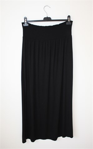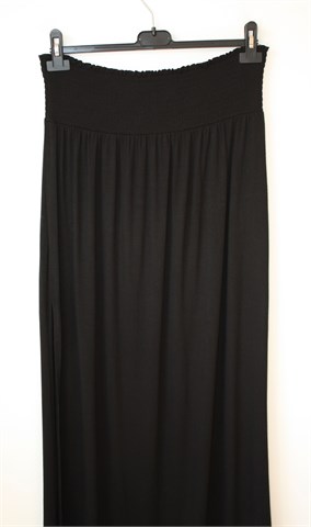 H&M dugačka/maxi suknja od viskoze, crne boje (može se nositi i kao haljina/tunika). U struku prošivena gumicama (prilagodljiva širina - vidjeti mjere), bočni veći prorezi (počinju na cca 42 cm dužine suknje). Mekana i rastezljiva.