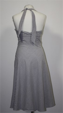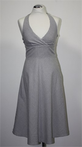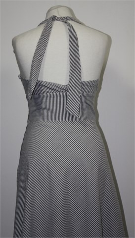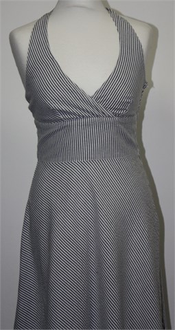 H&M haljina bijele boje sa crno-sivim prugama. Vezanje oko vrata (leđa su otvorena), bočni cif. Tanji i mekan pamuk.