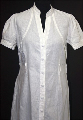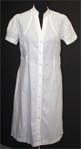 H&M haljina sa kratkim rukavima bijele boje, odlična kombinacija lana i pamuka. Prednje kopčanje, gumbići na krajevima rukava. Strukirana, ušice za remen (bez remena). Lagana i prozračna, moguće providna.
