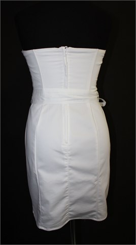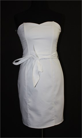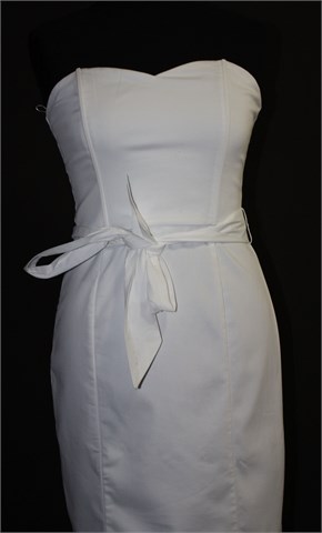 H&M haljina bez naramenica, bijele boje. Gornji dio krojen kao korzet i ima četiri plastične žice koje odlično drže formu. Podstavljena u gornjem dijelu a uz sami gornji unutarnji rub haljine našivena je silikonska traka koja drži haljinu na mjestu. Bočne ušice za remen sa pripadajućim remenom (može se skinuti). Stražnji cif i gumbić. Blago rastezljiva.
