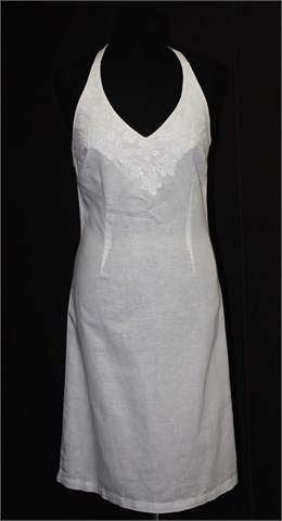 H&M ljetna haljina bijele boje, odlična kombinacija lana i pamuka. Sa prednje strane aplikacije od bijelog konca, vezanje oko vrata (leđa su otvorena). Strukirana, cif sa stražnje strane. Lagan materijal, moguće providan.