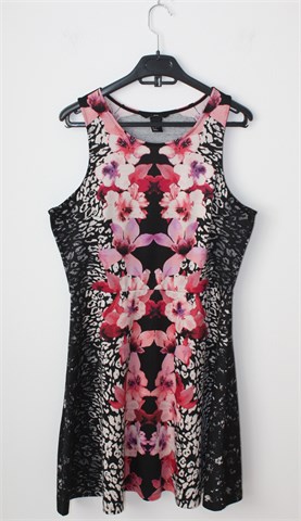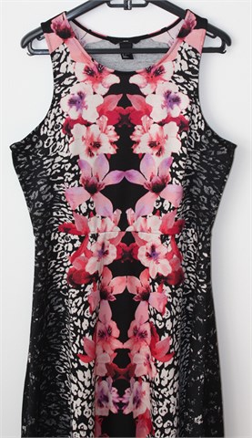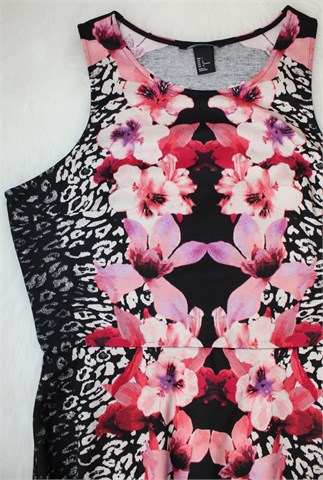 H&M haljina bez rukava, crne boje sa šarenim printom (boje i uzorak printa vidljivi na slikama). Rastezljiva.