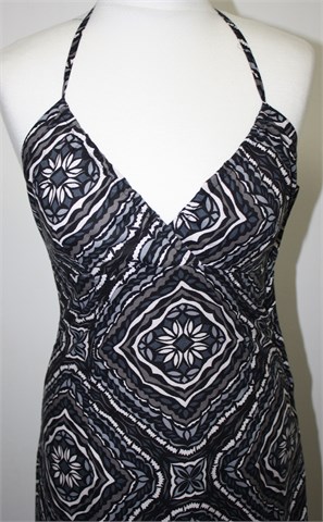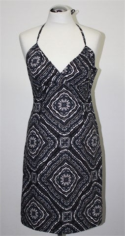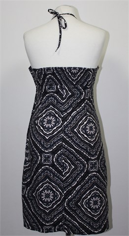 H&M haljina crne boje sa uzorkom (boje kao na slici). Vezanje oko vrata, leđa su otvorena (na leđima gumice pa je širina prilagodljiva). Bočni cif i gumbić. Lagan i mekan pamuk.