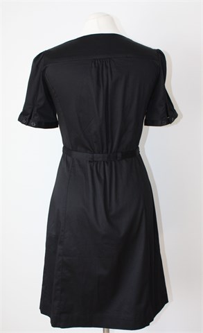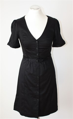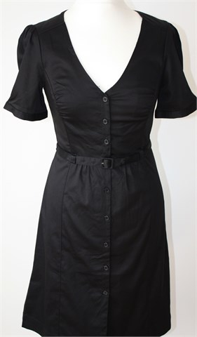 H&M haljina sa kratkim rukavima, crne boje. Prednje kopčanje, u struku pripadajući remen (može se skinuti). Strukirana, mekan i blago rastezljiv pamuk.