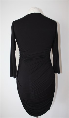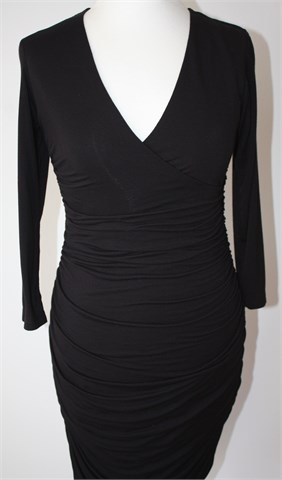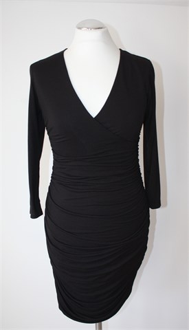 H&M haljina sa poludugim rukavima, crne boje. Sa prednje strane fiksni preklop, bočni nabori (sa obje strane). Podstavljena (osim rukava), rastezljiva.