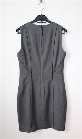 H&M haljina crno-bijele boje sa uzorkom na materijalu, poslovnog kroja. Stražnji cif, podstavljena. Strukirana.