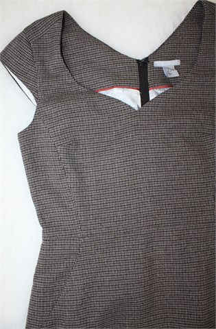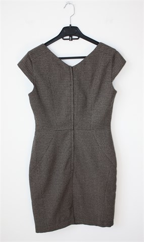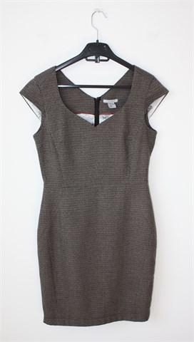 H&M haljina od štofa sa kratkim rukavićima, kombinacija crne, smeđe i sive boje sa uzorkom na materijalu (vidljivo na slikama). Strukirana, podstavljena. Stražnji skriveni cif, mali rasporak po sredini sa stražnje strane. Blago rastezljiva.