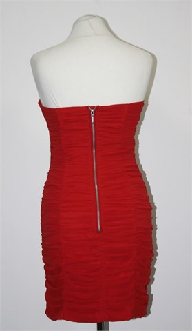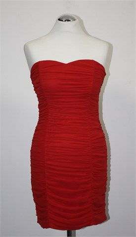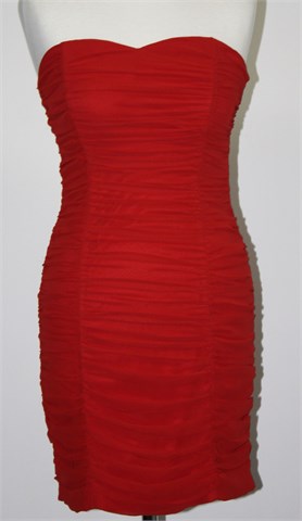 H&M haljina sa naborima, crvene boje (intenzivnija crvena boja nego na slikama). Stražnji cif i gumbić, silikonska traka u gornjem dijelu (drži haljinu na mjestu). Blago rastezljiva, prilagođava se tijelu.