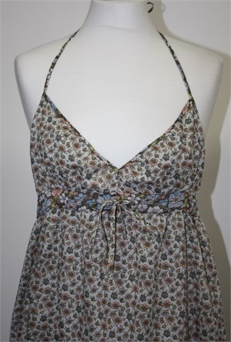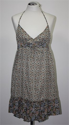 H&M haljina sa vezanjem oko vrata, neutralne sivo-bež boje sa lijepim cvjetnim printom (boje i uzorak printa vidljivi na slikama). Rastezljiva gumica ispod prsiju i na leđima pa je širina prilagodljiva (vidjeti mjere). Tanak i mekan pamuk, nije rastezljiv.