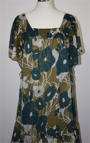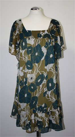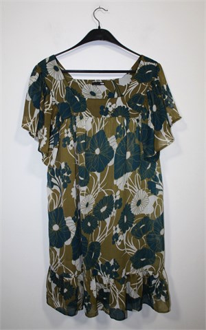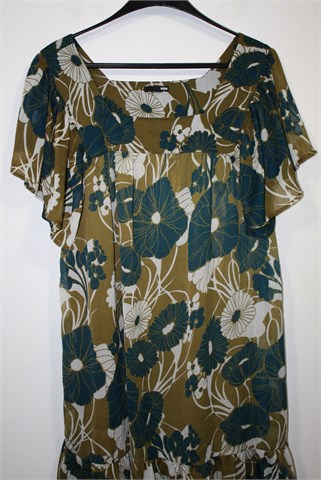H&M haljina/tunika sa kratkim rukavima, maslinasto-smeđe boje sa cvjetnim printom (boje i uzorci kao na slikama). Široki rukavići, volančić na dnu. Podstavljena (osim rukavića), bočne ušice za remen (jedna se malo odšila pa bi samo trebalo uhvatiti koncem). Lagana i prozračna, blago rastezljiva.
