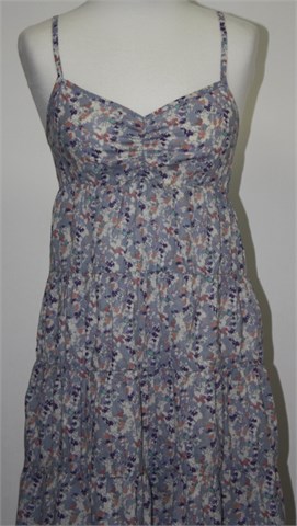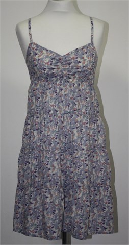 H&M haljina svijetlo pastelno plave boje sa cvjetnim printom. Naramenice su tanke i prilagodljive dužine (kao na grudnjaku), šira u donjem dijelu. Ispod prsiju i na leđima su provedene gumice pa je gornji dio dosta rastezljiv i prilagodljiv (mjereno maksimalno rastegnuto - vidjeti mjere). Tanji i lagan pamuk.