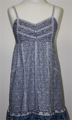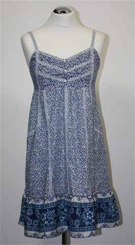 H&M pamučna haljina sa tankim podesivim naramenicama, kombinacija bijele i plave boje sa cvjetnim printom - mjestimično ukrašena čipkastim trakicama. Na leđima su prošivene gumice pa je širina prilagodljiva. Mekan i lagan pamuk.