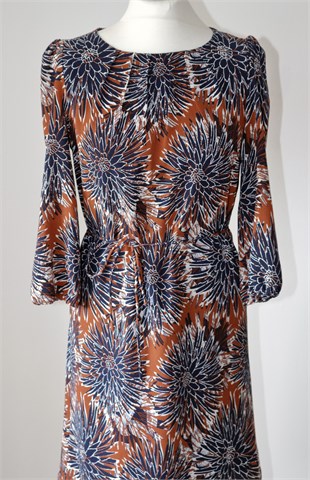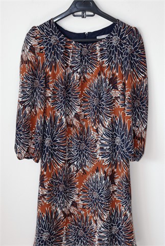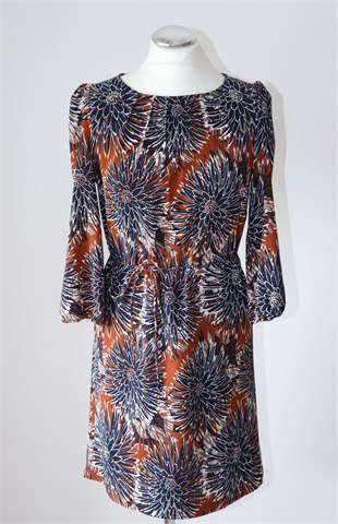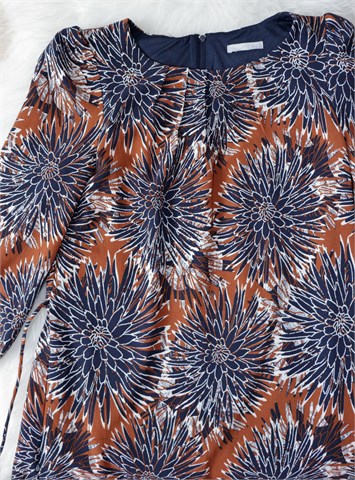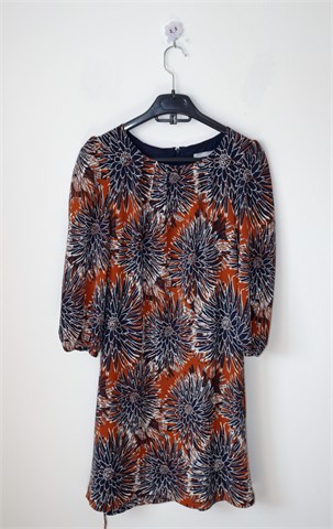 H&M haljina sa poludugim rukavima sa printom (boje i uzorak printa vidjivi na slikama). Stražnji cif, gumica na kraju svakog rukava. U strukubočne ušice za remen sa malim remenčićem od istog materijala (može se skinuti). Podstavljena (osim rukava), blago rastezljiva.