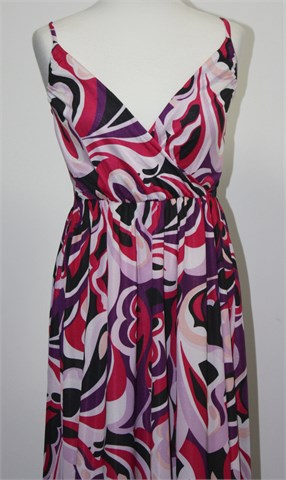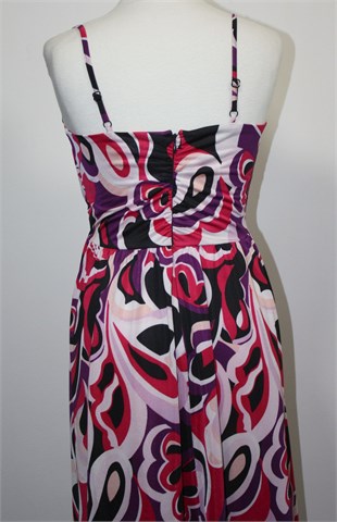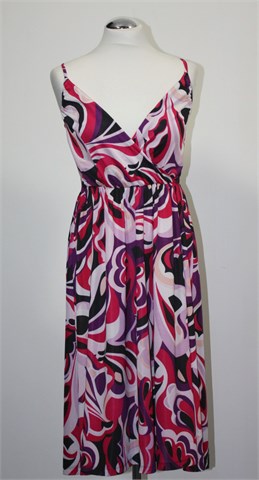 H&M haljina sa šarenim printom (boje i uzorak printa vidljivi na slikama), naramenice su tanke i podesive (kao na grudnjaku). Prednji fiksni preklop (materijal je dupli), rezana ispod prsiju i prema dolje se blago širi. Sa stražnje strane cif i kopčica. Rastezljiva.