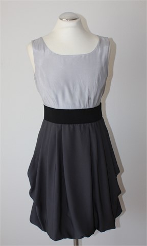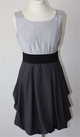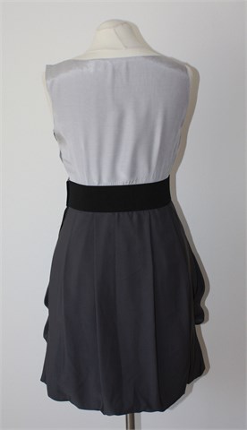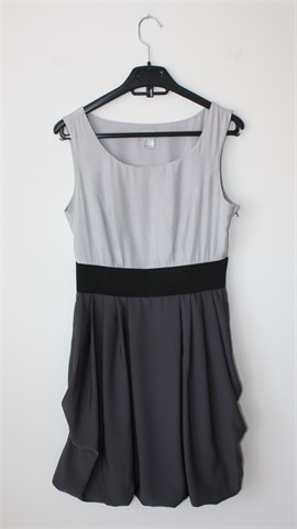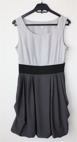 H&M haljina bez rukava, u dvije nijanse sive boje (gornji dio svijetlo sive boje, donji dio tamno sive boje). U struku guma crne boje, bočni skriveni cif. Nabori u donjem dijelu (na dnu balon kroja), blago sjajan materijal. Podstavljena.