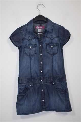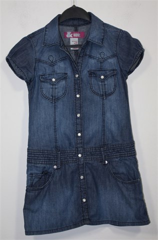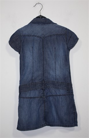 H&M haljina/tunika sa kratkim rukavima, traper plave boje. Prednje kopčanje sa drukerima, džepići na prsima. Pasica za remen, prednji bočni džepovi.