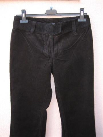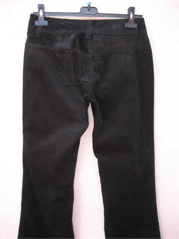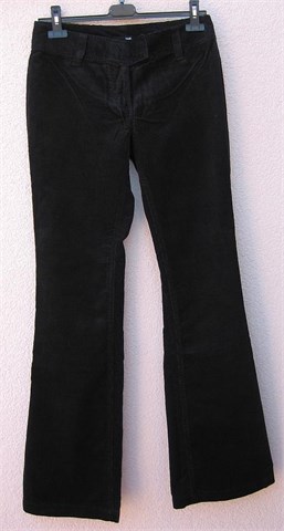 Samt hlače crne boje. Ravne nogavice, niži struk. Nemaju džepove, imaju pasicu za remen. Prednji gumb i kopčanje na cif. Nisu rastezljive.
