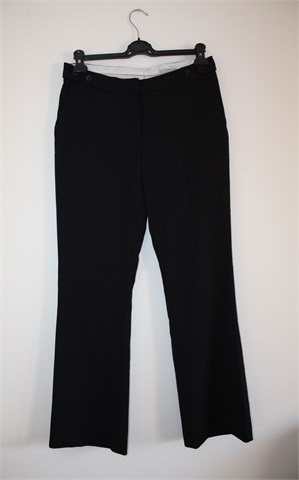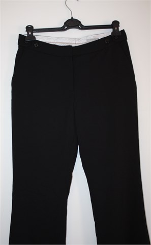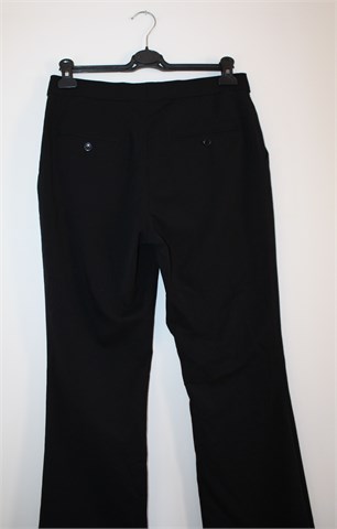H&M hlače od tanjeg štofastog materijala crne boje (klasični kroj, nosive cijelu godinu). Prednji cif i kopčanje, prednji i stražnji džepovi. Bočno u struku regulacija širine struka. Malo oštećenje na materijalu unutar pasice (nije vidljivo i ne smeta kod nošenja).