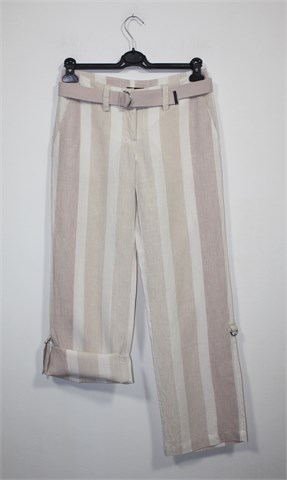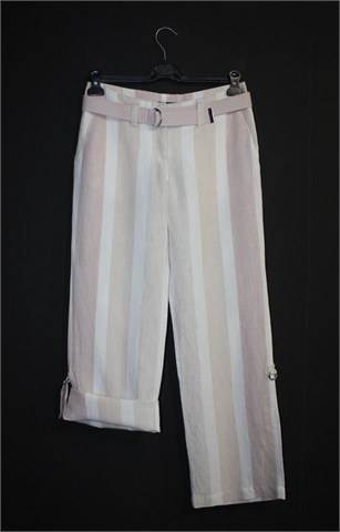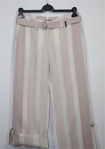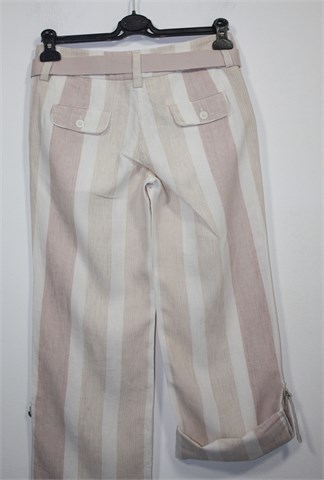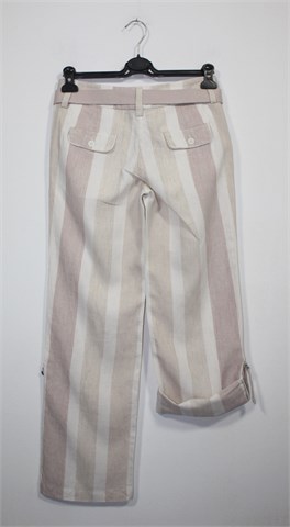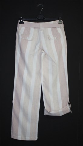 H&M hlače od lana, bijele boje sa prugama (prljavo rozo-bež boje). Prednji cif i kopčanje, pasica za remen (jedna ušica se malo odšila) sa pripadajućim remenom (može se skinuti). Prednji bočni, stražnji džepići sa preklopom i gumbom. Nogavice se mogu nositi i kao kraće (vidljivo na slikama). Čvrste ali lagane, nisu rastezljive.