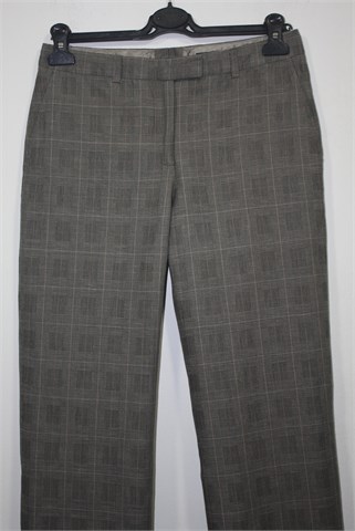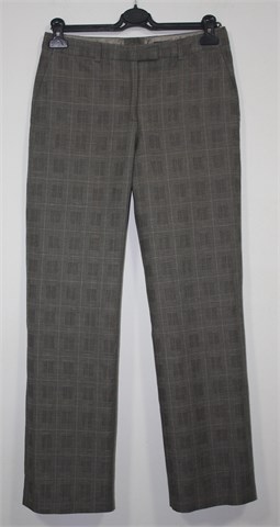 H&M hlače od odličnog, laganog materijala (kombinacija lana i pamuka), sivo-smeđe boje sa prugasto-kariranim uzorkom. Kroj hlača je klasičan, imaju prednji cif i kopčanje, pasicu za remen. Prednji bočni džepovi, mali stražnji džep (još uvijek zašiven).
