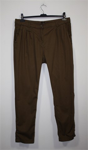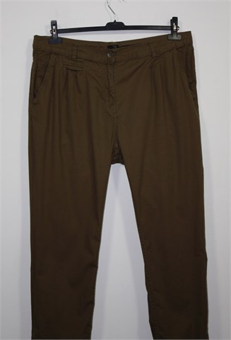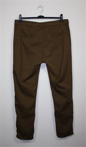 H&M pamučne hlače chino kroja (šire u gornjem dijelu, uže u nogavicama), smeđe-maslinaste boje. Prednji cif i kopčanje, pasica za remen. Prednji bočni, stražnji skriveni džepovi sa gumbom. Tanji i lagan pamuk.