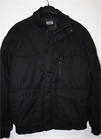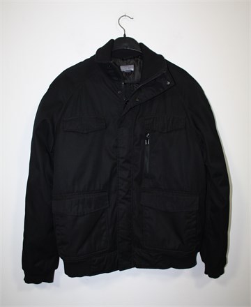 H&M jakna crne boje, odličan kroj i model. Prednji skriveni cif i kopčanje sa drukerima, prednji džepovi sa preklopom i drukerom (2 na prsima, 2 klasična), džepić sa cifom sa prednje lijeve strane. Dva unutarnja džepića sa gumbom. Jakna je podstavljena sa poliesterskim punjenjem (ne predebelo), blago stegnuta u rukavima i na bočnim stranama pasice. Višlji ovratnik (može se nositi skroz zakopčan ili rastvoren).