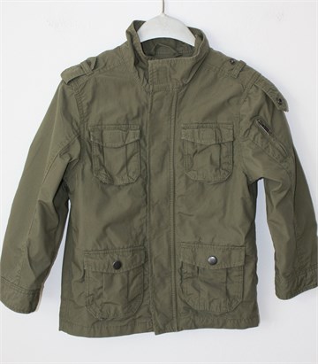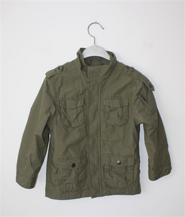H&M pamučna jakna maslinasto zelene boje, podstavljena tankom podstavom. Prednje kopčanje sa cifom i skrivenim drukerima, prednji džepovi sa preklopom i drukerom, džepovi na prsima (i jedan džep sa cifom na rukavu). Nije rastezljiva.