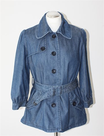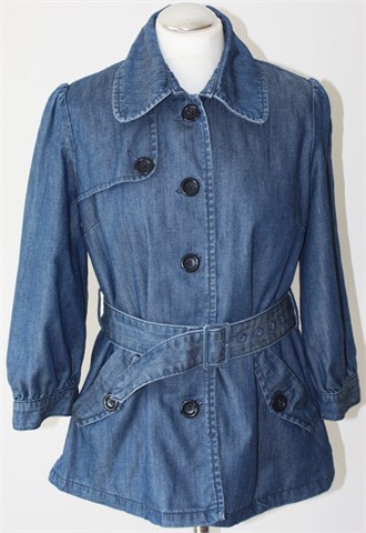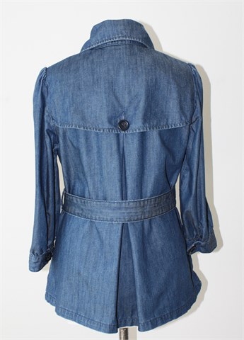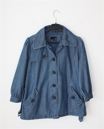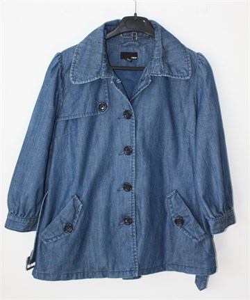 H&M jakna od trapera, plave boje (krojena kao baloner), mjestimično blago ispranog izgleda. Poludugi rukavi, prednje kopčanje. Bočni džepovi, pripadajući remen u struku (može se izvaditi). Podstavljena.