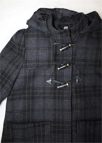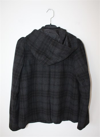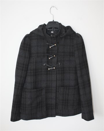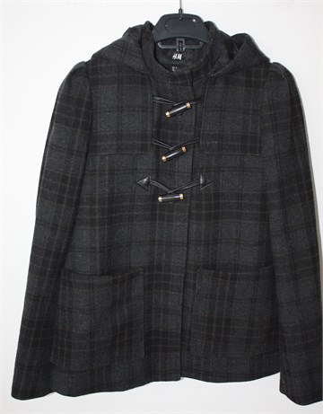 H&M kraći kaput sivo-crne boje sa uzorkom (vidljivo na slikama). Prednji cif i kopčanje sa tri ukrasna gumba, bočni džepovi. Kapuljača (zašivena), podstavljen.