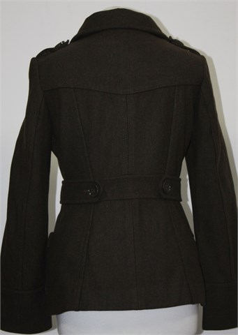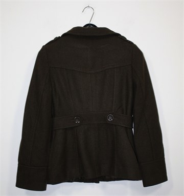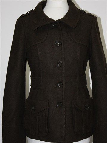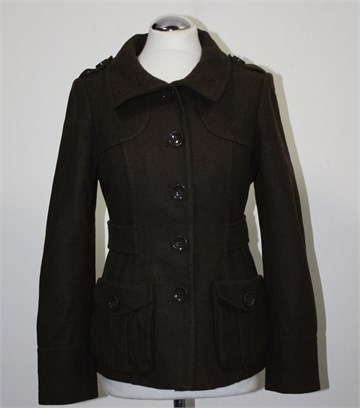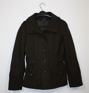 H&M kraći kaput smeđe-maslinaste boje. Prednje kopčanje, bočni džepovi. Strukiran, podstavljen.