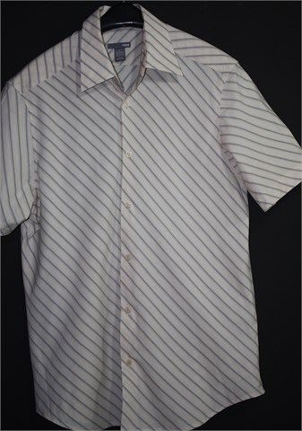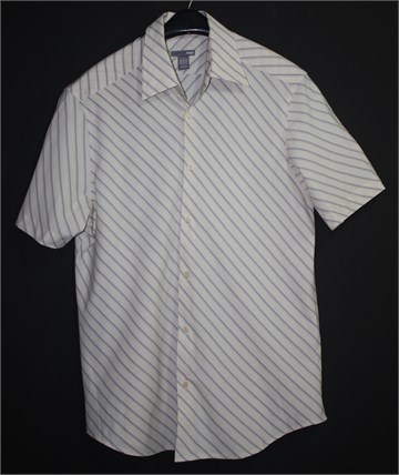 H&M muška košulja, svijetlo bež boje sa kosim prugama u plavoj i smeđoj boji. Kratki rukavi, prednje klasično kopčanje. Lagan i vrlo blago rastezljiv materijal.