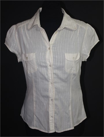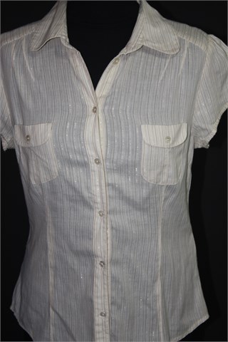 H&M košulja sa kratkim rukavima, svijetlo bež boje sa zlaćanim i svijetlo smeđim prugama. Prednje kopčanje, džepići na prsima. Lagan i prozračan pamuk.